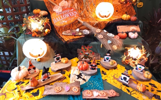 10月上旬の青葉の森公園です。散歩の途中に立ちよった管理センターの入り口にハロウィンの飾り付けがされていました。