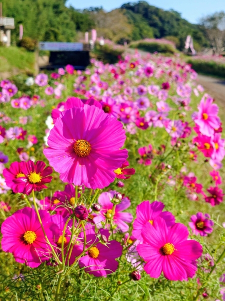 10月中旬の武田川コスモスロードです。ピンクの濃いコスモスと緑の葉のコントラストが綺麗でした。