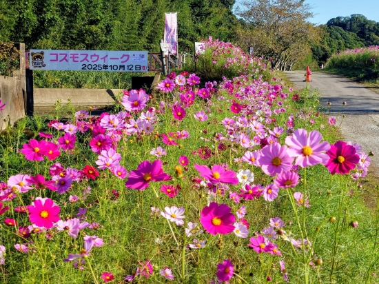 10月中旬の武田川コスモスロードです。武田堰の斜面に咲いた沢山のピンクのコスモスが見頃で綺麗でした。
