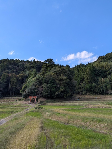 稲刈り後の棚田に熊野神社の朱塗りの鳥居が素敵でした。