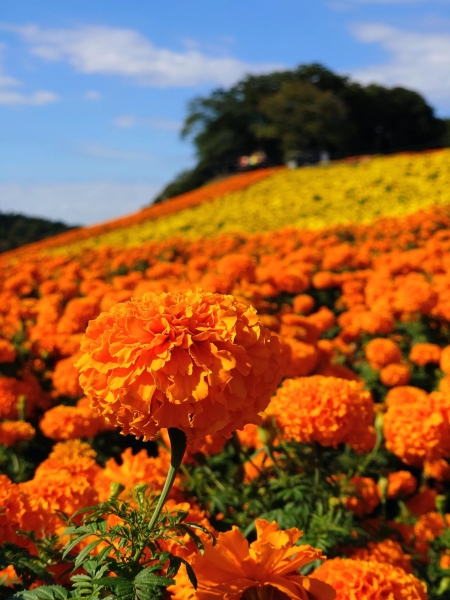10月下旬の東京ドイツ村です。いろどりの丘に植えられたオレンジと黄色のマリーゴールドが、緑と青空に映えて綺麗でした。