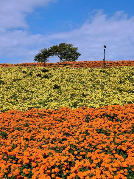10月下旬の東京ドイツ村です。いろどりの丘に植えられたオレンジと黄色のマリーゴールド、そして青空のコントラストが綺麗でした。