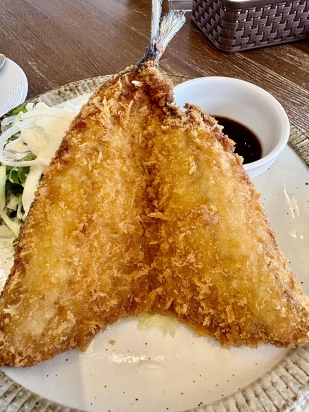 てっぱつとは、房総言葉で大きいこと 名は恥じない巨大なアジフライ、揚げたての熱々が出て来ました。