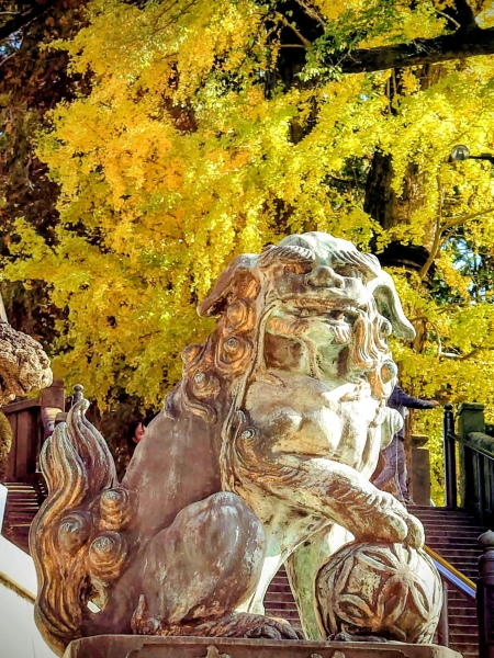 11月中旬の成田山です。勇ましい狛犬と黄色く黄葉したイチョウとのツーショットです。おかげで迫力ある写真が撮れました。