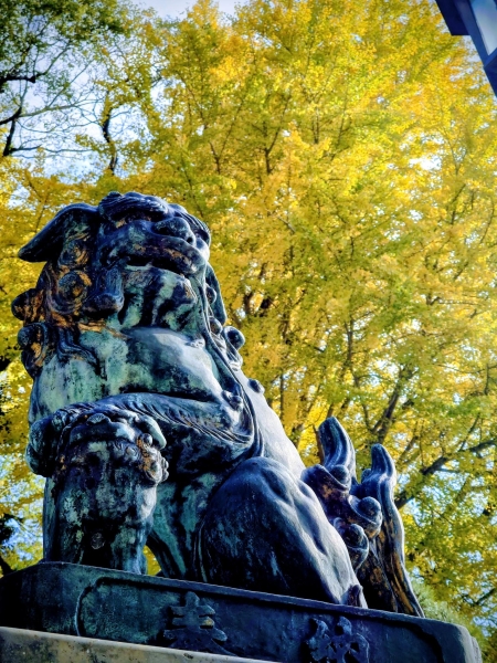 11月中旬の成田山です。勇ましい狛犬と黄色く黄葉したイチョウのツーショットです。おかげで迫力ある写真が撮れました。