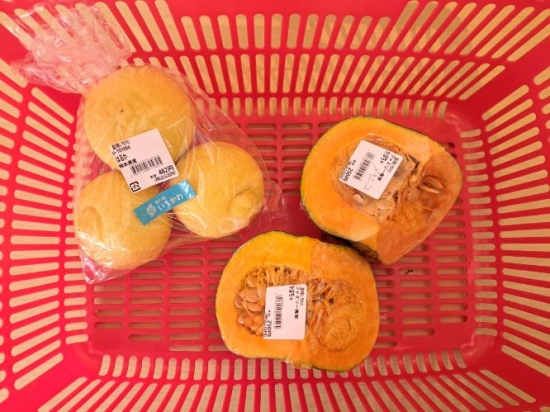 購入した後、即カシャ☆した後のお写真です。「ウトブランドフェア」で購入した熊本県産の「はるか」、そしてカボチャたちです!!