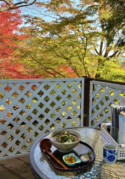 紅葉の名所、養老渓谷粟又の滝から徒歩3、4分にあるお休み処いちぼう茶家(茶屋ではなく茶家)さん。 11月20日の様子です。 12時前に着いたのでテラスのいい席があいていました。 最高のお昼ごはんです。 イチョウは色づいていますが、遊歩道周辺の木々は見頃一歩手前といったところ。 崩落などで通行できない場所もあるので、行かれる方は事前に調べたほうがよさそうです。