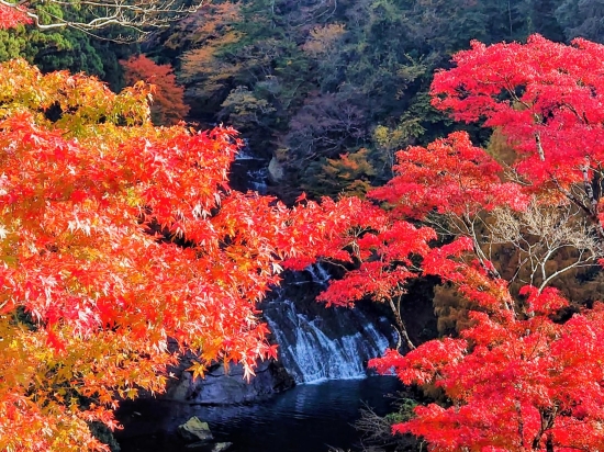 11月下旬の養老の滝展望台です。午後の陽を浴びて紅葉したモミジが赤く輝いて綺麗でした。バックの白い粟又の滝とのツーショットです。