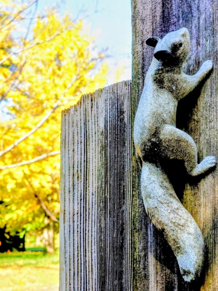11月中旬の青葉の森公園です。案内看板に小さなリス?のオブジェがありました。リアルだったので、黄葉したイチョウとのツーショットを撮りました。