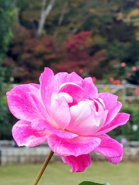 11月中旬の千葉市都市緑化植物園です。園内にはまだバラが咲いていました。ピンクの花がバックの紅葉したモミジに映えて綺麗でした