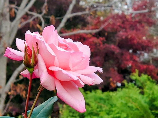 11月中旬の千葉市都市緑化植物園です。園内にはまだバラが咲いていました。淡いピンクの花が紅葉したモミジと緑に映えて綺麗でした。