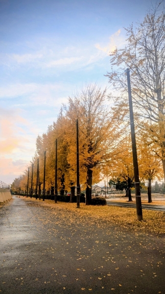 日が沈みかけている空とイチョウ並木の黄色がすごくキレイでした。