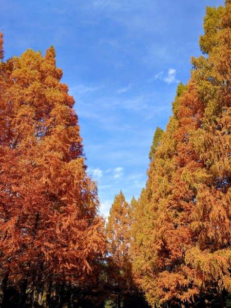 11月下旬の亀山湖畔公園です。赤く紅葉したメタセコイヤの並木が、青空に映えて綺麗でした。
