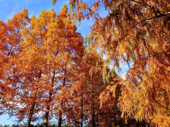 11月下旬の亀山湖畔公園です。赤く紅葉した背の高いメタセコイヤが青空に映えて綺麗でした。