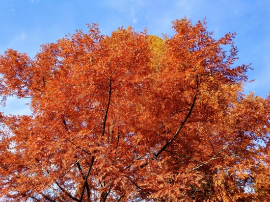 11月下旬の亀山湖畔公園です。真っ赤に紅葉したメタセコイヤが青空に映えて綺麗でした。