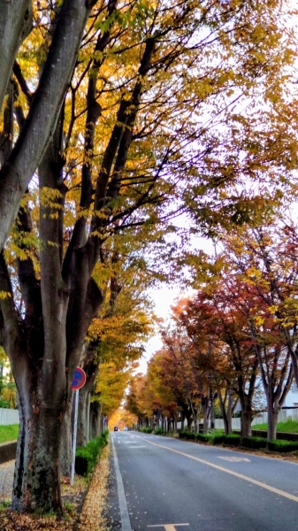 少し終わりかけの紅葉ですが、イチョウだけではなく、赤い葉っぱもあってきれいな並木道です。交差点が近いので気をつけてパシャリ。