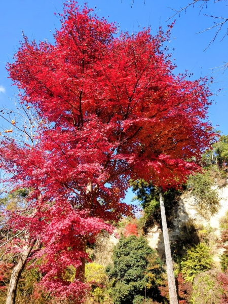 11月下旬のクオードの森です。今年はイルミネーションがないので昼間に訪れました。真っ赤に紅葉したモミジと青空のコントラストが綺麗でした。