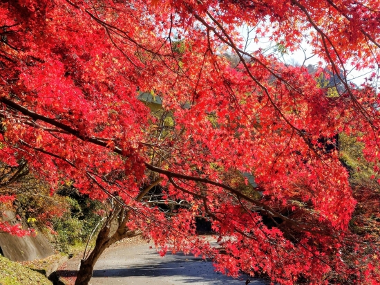 11月下旬のクオードの森です。今年はイルミネーションがないので昼間に訪れました。赤く紅葉したモミジが陽を浴びて輝いて綺麗でした。