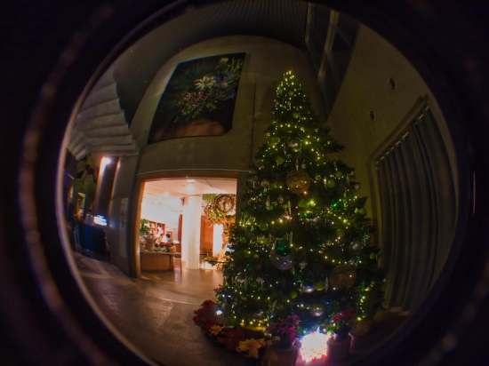 入ってすぐ、クリスマスツリーが出迎えてくれます。botanica museun at 18:40 Dec,6 2025(GRD 1st+holga fish eye)