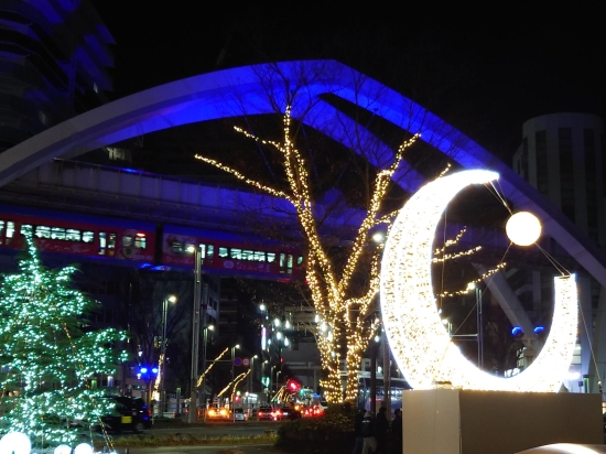 12月中旬の千葉中央公園です。ルミラージュちばの三日月のイルミネーションと青くライトアップされたセントラルアーチ、そしてモノレールのスリーショットです。