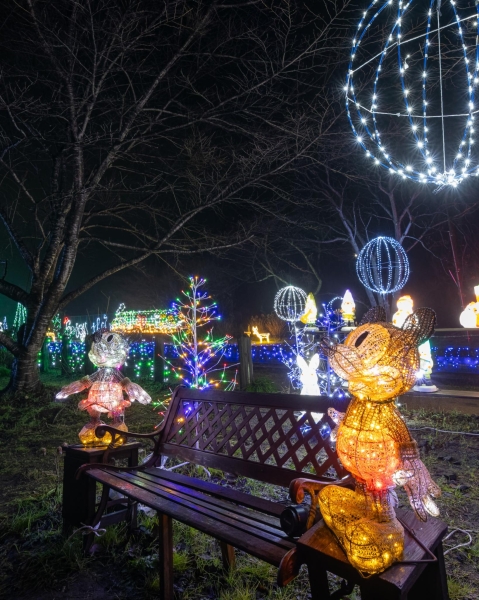 冬の夜、森の中に広がる光の世界。 ベンチに座って、ただ眺めていたくなる静かな時間。 イルミネーションが、心までそっと照らしてくれる夜でした🌜️