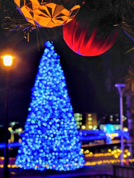 12月中旬のケーズハーバーです。桟橋広場に青くイルミネーションされた大きなツリーがありました。手前にクリスマス飾りがあったので一緒に撮りました。