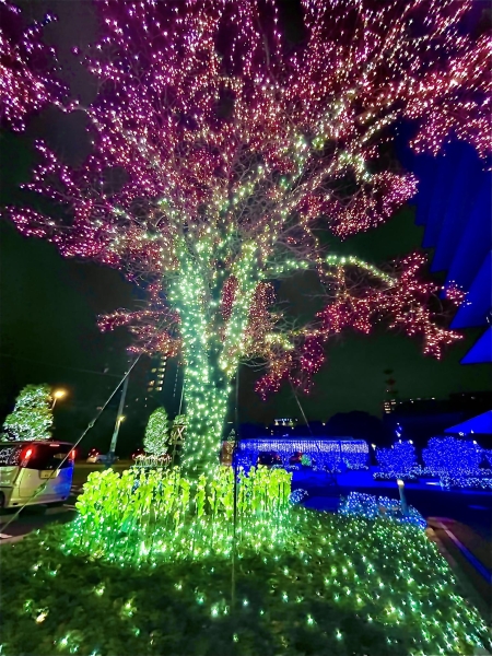 夜桜や藤の花の様な飾り木々のライトアップ