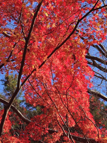 12月上旬のもみじロードです。真っ赤に紅葉したモミジが陽を浴びて青空に映えて綺麗でした。