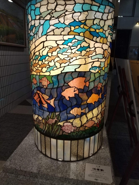 休暇村館山のロビー 魚のステンドグラスオブジェ ブュッフェで房州寿司や、さんが焼きなど、沢山食べて満腹 温泉♨️て癒されました