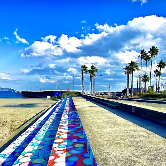 ヤシの木と空と海と階段に描かれたカラフルな模様綺麗でした