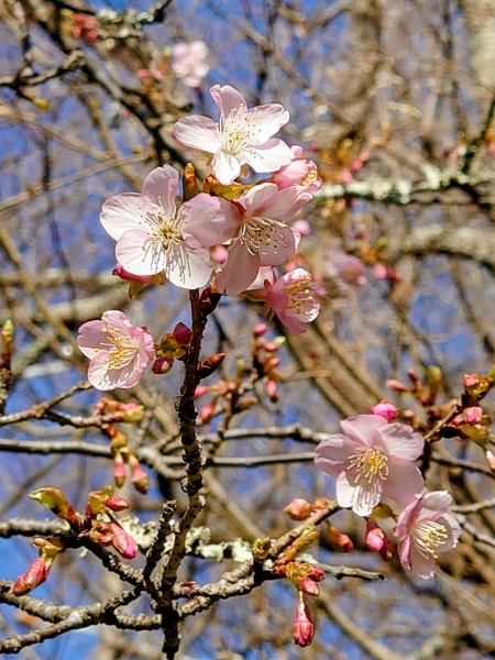 1月上旬のをくずれ水仙郷です。水仙を見に来ましたが、もう頼朝桜(河津桜)が咲いていました。ピンクの花が青空に映えて綺麗でした。
