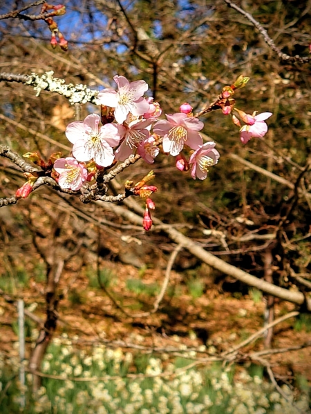 1月上旬のをくずれ水仙郷です。水仙を見に来ましたが、もう頼朝桜(河津桜)が咲いていました。桜と水仙の貴重なツーショットです。