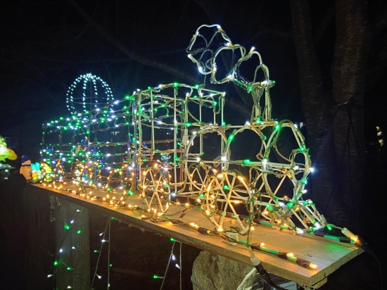 12月下旬の月崎駅です。駅の直ぐ近くにイルミネーションされた蒸気機関車がありました。暗闇に緑やオレンジのイルミネーションが映えて綺麗でした。