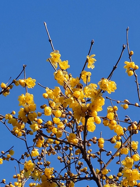 1月中旬の江月水仙ロードです。水仙を見に来ましたが、ろうばいも咲いていました。黄色い花が雲ひとつない新春の青空に映えて綺麗でした。