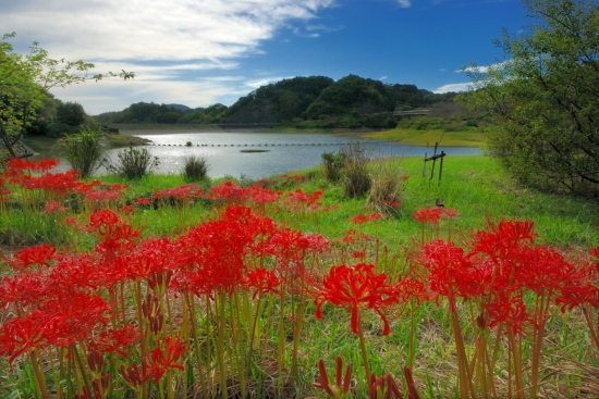 佐久間ダム公園は桜と水仙のイメージですが秋にはあちこちに彼岸花が咲きます。背景に湖面が入るように良さげな場所を探しました。