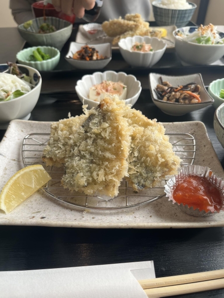 見た事ないアジフライ。フワフワでボリューム感も満点でした。