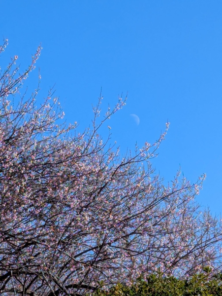 満開の梅の向こうにお月様