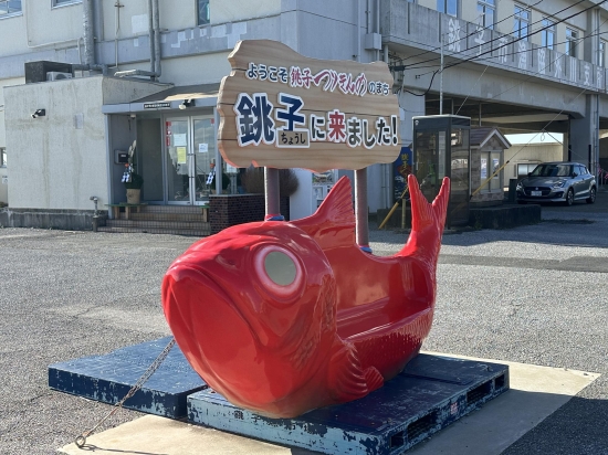 銚子電鉄終点の外川駅から犬岩や屏風ヶ浦までの散策途中、今銚子でイチオシのきんめだいの形をした椅子が、外川漁港にあり。坂の漁港を歩いて疲れたら、ちょっとひと休み。