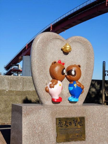 1月上旬の中の島公園です。可愛いタヌキのカップルの恋人の聖地のオブジェと中の島大橋を一緒に撮りました。金のプレートが新春の青空に映えて綺麗でした。