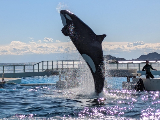 シャチと虹色に輝く水しぶき