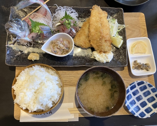 アジフライ、刺身、なめろうがたっぷりでおいしい😋