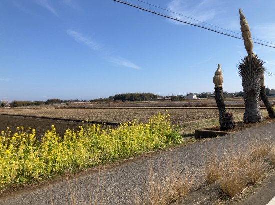 白子温泉に行く途中。千葉県の気候が暖かい事と千葉県の方が温かい事を黄色の菜の花と植物をいたわる風景を見て感じました。