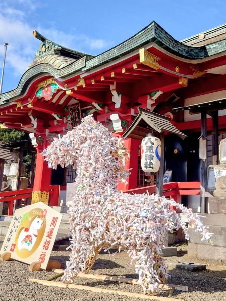 1月下旬の人見神社です。千葉県で今年の干支の午を検索したら、人見神社が検索されました。馬にゆかりのある神社のようです。朱塗りの本殿と白いおみくじの馬が青空に映えて綺麗でした。