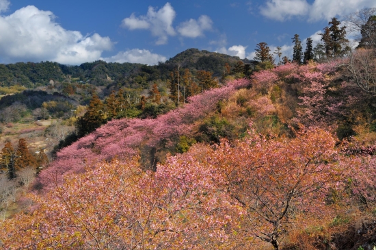 水仙と入れ替わるように公園内のあちこちに河津桜が咲きます。中でもここ山頂からの景色が1番です。