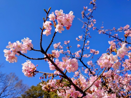 2月中旬の千葉ポートタワーです。野外ステージ後ろにも河津桜が咲いていました。濃いピンクの花と青空のコントラストが綺麗でした。