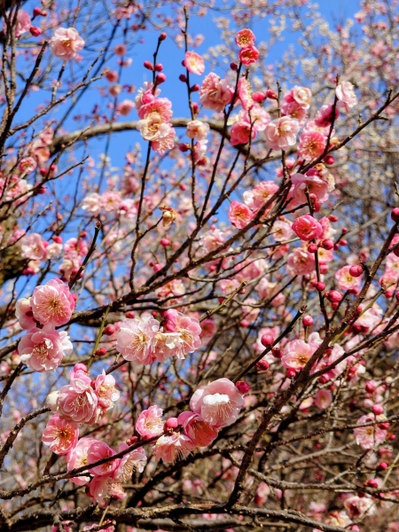 2月中旬のあけぼの山農業公園です。沢山の紅梅や白梅が見頃でした。ピンクの花が青空に映えて綺麗だったのでアップで撮りました。