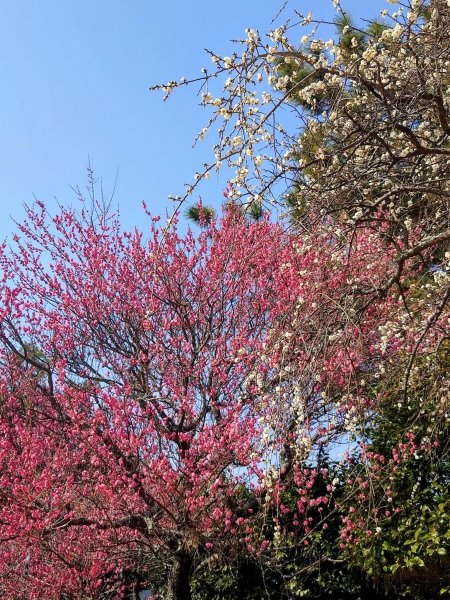 2月中旬のあけぼの山農業公園です。東屋前の紅梅と白梅が見頃でした。ピンクと白い花、そして青空のコントラストが綺麗でした。