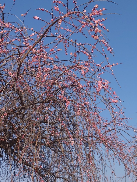 2月中旬のあけぼの山農業公園です。風車近くのしだれ梅が見頃でした。ピンクの花が青空に映えて綺麗でした