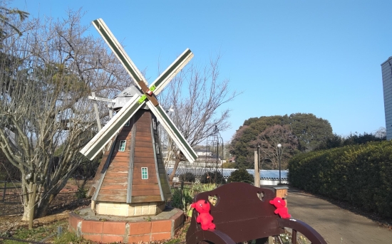 あけぼの山農業公園に行って来ました。小さな風車の前の椅子にちーばくんを置いて一緒に撮りました。赤いちーばくんが青空に映えます♡