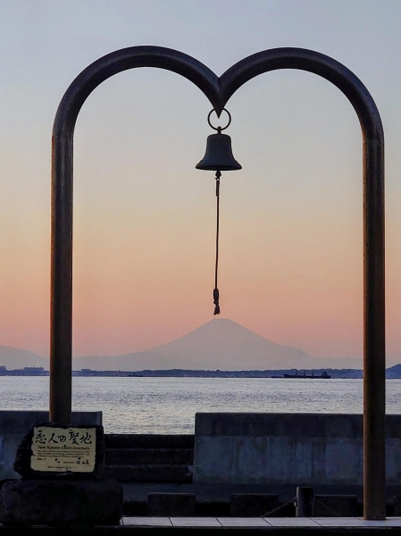 1月下旬、浜金谷の幸せの鐘です。日の入り後、オレンジの夕空に富士山が浮かび上がったので、シルエットの幸せの鐘と一緒に撮りました。
